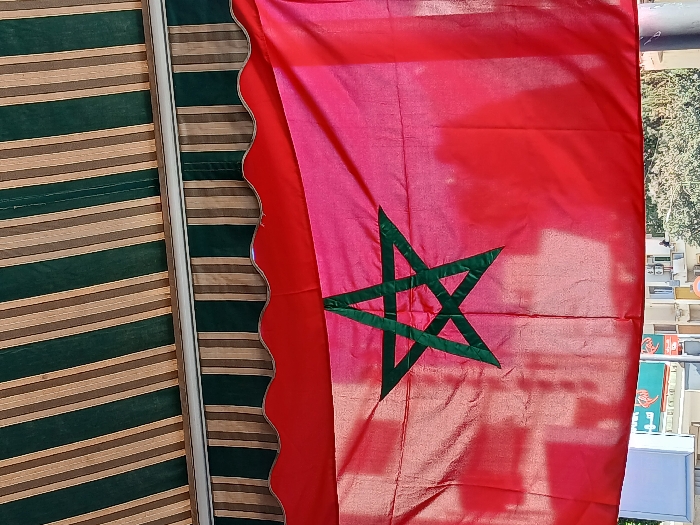 A Moroccan flag is prominently displayed, hanging vertically and centrally, beneath a striped awning and its decorative valance