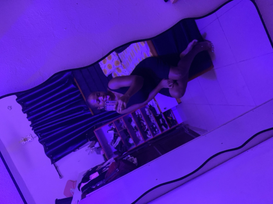 A person takes a selfie in a wavy mirror. She wears a black outfit, seated cross-legged on the floor. Behind her in the mirror's reflection is a dark curtain, a clothing rack with numerous items, and a shirt with sunflower patterns. The room is illuminated by purple lighting, creating a distinct color cast over the scene. The tiles on the floor are white.