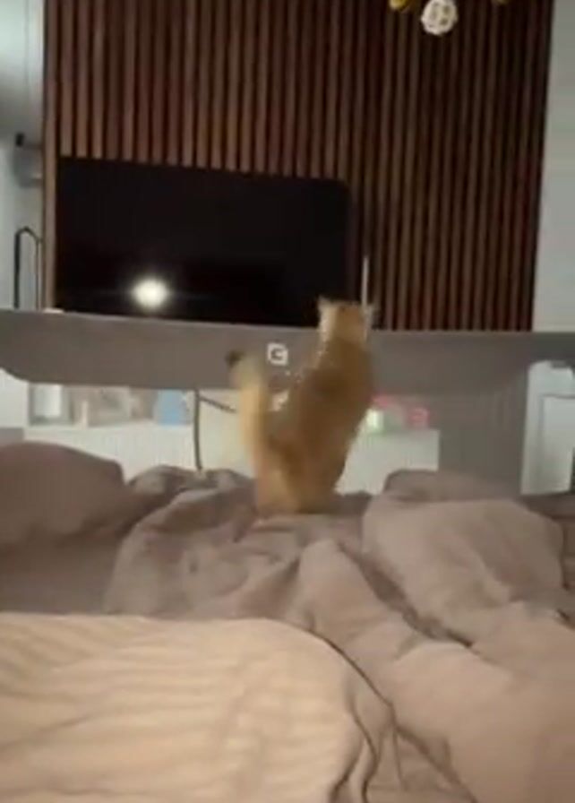 A ginger cat jumps from a bed onto a crib rail in a bedroom. The bed has grey bedding, and a grey crib rail is attached to it. The wall behind the bed has a dark wood slat design, and a television is mounted on the wall. There are hanging decorations with bees above the bed.