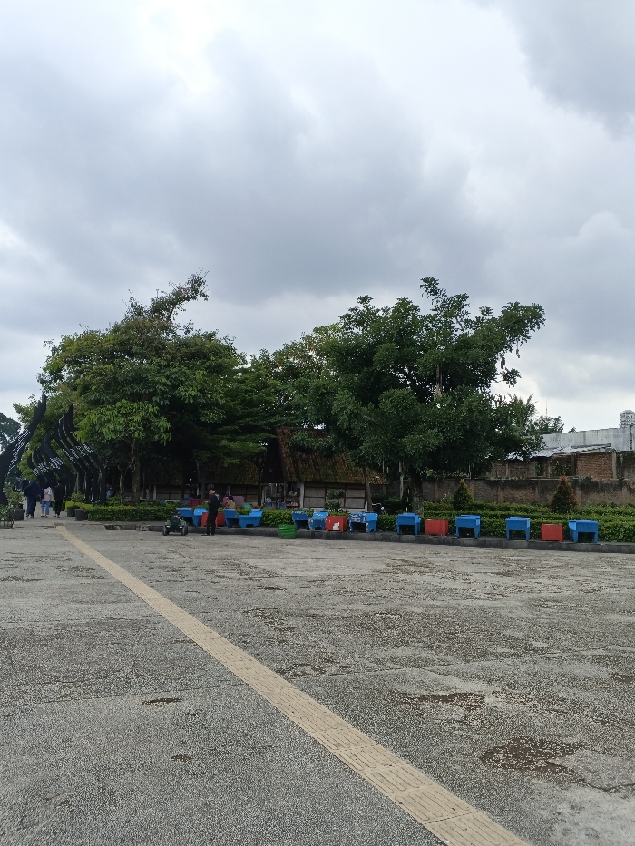 The image portrays an outdoor public area in thành phố Biên Hòa, Vietnam, under an overcast sky. The foreground features a broad, grey paved surface composed of small aggregate, bisected by a light-colored tactile paving strip running diagonally from the lower center to the mid-right. In the midground, a dense line of green trees extends across the frame. To the far left, partially obscured by trees, a dark, curved structure, possibly an archway or decorative element, is visible. Several indistinct figures are seen walking in this area towards the background. Central to the midground, a rustic-style building with a thatched roof and wooden beam supports is situated among the trees. To the right of the central building, a series of small, brightly colored rectangular stands or tables, predominantly blue and red, are arranged in a line along a low green hedge. One individual, dressed in dark clothing, stands near a blue stand, facing towards the rustic building. A small green wheeled cart is positioned on the pavement near this person. Additional figures are present near the colored stands, their actions not clearly discernible. Beyond the foliage and stands, a low brick wall is visible, with a larger, light-colored building in the far background. The sky is uniformly grey and heavily clouded, indicating diffused natural light.