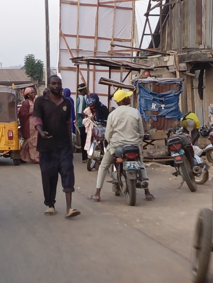 A busy street scene unfolds, with a man in a black shirt and dark pants walking towards the viewer. In the background, several people are gathered around parked motorcycles. One man is seated on a motorcycle wearing a yellow cap and light-colored clothing. Nearby, a three-wheeled vehicle is visible. Makeshift structures line the street, including a large white billboard frame. A blue sign with "KT" is seen hanging in one of the structures.