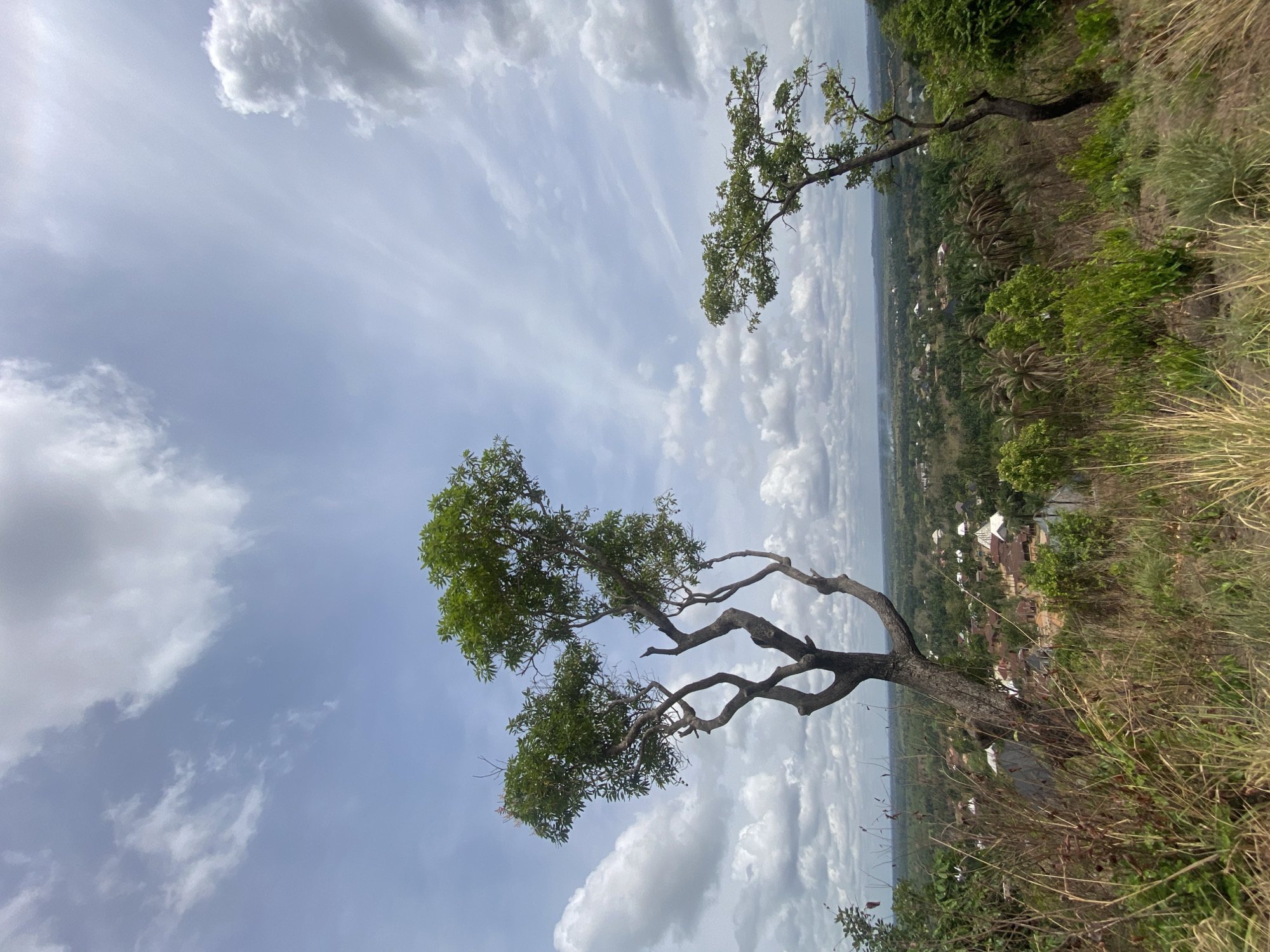 The image displays an elevated panoramic view of a residential area within Nguzu Edda, Nigeria, under a partly cloudy sky. The upper two-thirds of the frame consists of a light blue sky filled with scattered white cumulus clouds and subtle, wispy cirrus clouds. In the foreground, an unkempt hillside is visible, covered predominantly by dry, light brown grasses and some patches of green vegetation. Two prominent trees with green foliage are positioned in the midground: a larger, multi-trunked tree with dark, gnarled branches occupies the left-center, while a smaller, slender-trunked tree is on the right. Below this elevated vantage point, a sprawling section of the city is evident, featuring numerous buildings with varying roof colors (some light-colored, some darker), integrated within a dense landscape of green trees and vegetation, including visible palm trees. The background extends to a distant horizon line marked by undulating green terrain. No individuals or specific human activity are discernible within the frame.