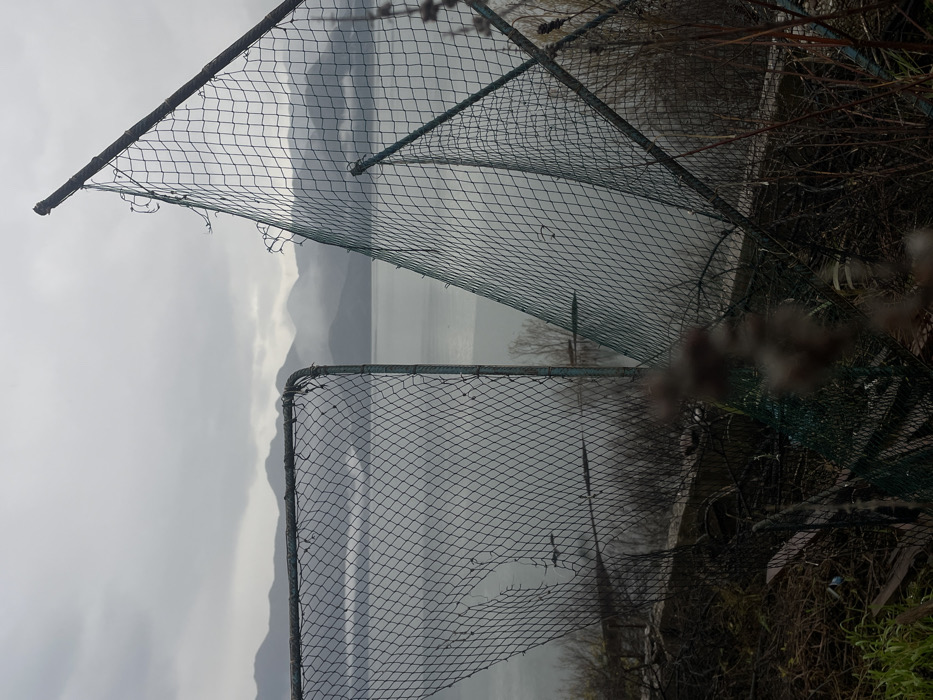 The scene depicts a neglected lakeside area in Vranjina, Montenegro, under an overcast sky. The foreground features two sections of a damaged chain-link fence, with overgrown, mostly dormant vegetation and some green grass at ground level. The left fence section is rectangular, light grey-blue, and exhibits a large tear or hole in its upper half. The right fence section is irregularly shaped, appearing triangular, with a grey-green tint, significantly bent and warped, and features loose, jagged wires along its upper edge. Both fence sections are supported by weathered metal posts. Beyond the fence, a tranquil, grey body of water, likely Skadar Lake, extends into the midground. The background is dominated by a range of dark, undulating mountains partially obscured by low-hanging clouds or mist. No individuals or animals are present.