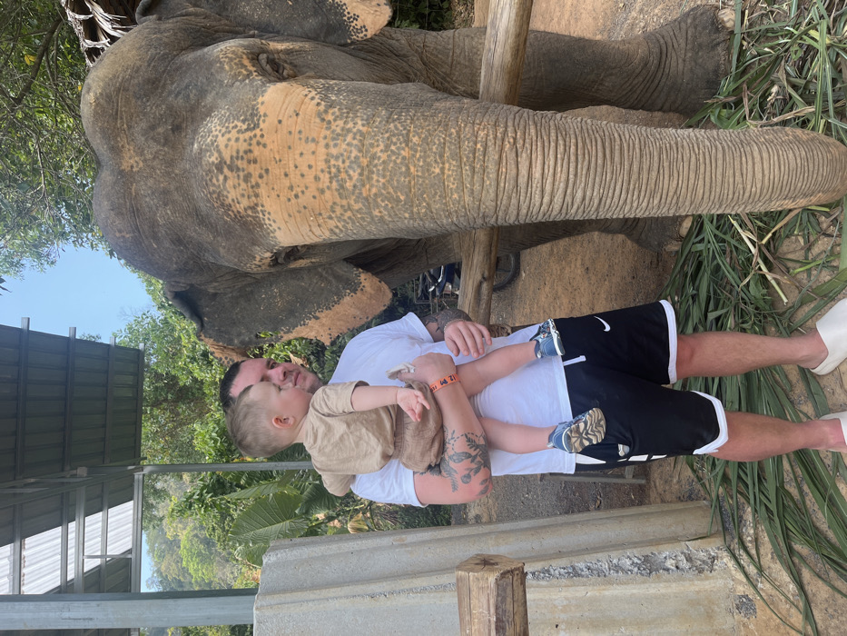 A man in a white shirt and black shorts holds a toddler in a tan outfit. Both are standing next to an elephant, whose head, ear, and trunk are visible. The background includes greenery and a metal structure. The scene seems to be a candid shot taken outdoors, likely at a zoo or animal sanctuary.