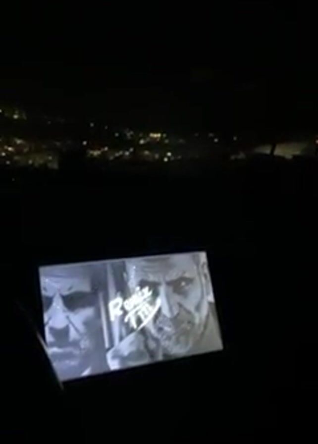 lit-up city skyline at night, viewed through what appears to be a car windshield. A screen, possibly a phone or tablet, is visible in the foreground, displaying a black and white image with the text "Rami TV." The image features two men with serious expressions. The overall scene suggests someone is watching media content while enjoying a view of the city at night.