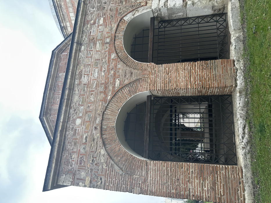 The image depicts a historical building, likely the Eski Mosque, situated in the city of Stara Zagora, Bulgaria, under an overcast sky. The structure's visible exterior wall is composed of alternating courses of reddish-brown bricks and irregularly shaped light-colored stone blocks. Two prominent, large arched openings dominate the lower section of this wall, both constructed from brickwork. Each arch is secured by dark-colored metal grates or gates, featuring a grid pattern with some diagonal cross-bar elements. Through the left arched opening, an interior space is visible, revealing another arched passageway secured by similar grates. Above the main wall, a dark, flat cornice runs horizontally, topped by another section of the building, which exhibits the same mixed brick and stone masonry. This upper section appears to form part of an octagonal base for a dome, a segment of which is partially visible on the upper right side of the frame. The building rests on a light-colored stone foundation. In the immediate foreground, a strip of green grass borders the building's base, transitioning to some exposed gravel or dirt. In the far left background, a portion of a modern, light-colored multi-story building is faintly visible, indicating an urban setting. No people, active subjects, or interactions are present in the scene.