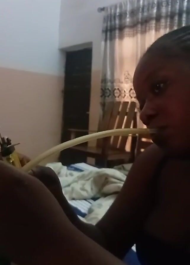 A woman is indoors, sitting in a bed and using a hose. A lighter is visible in the background. She appears to be drawing on the hose. There is a chair in the background, as well as a curtained window and a door.