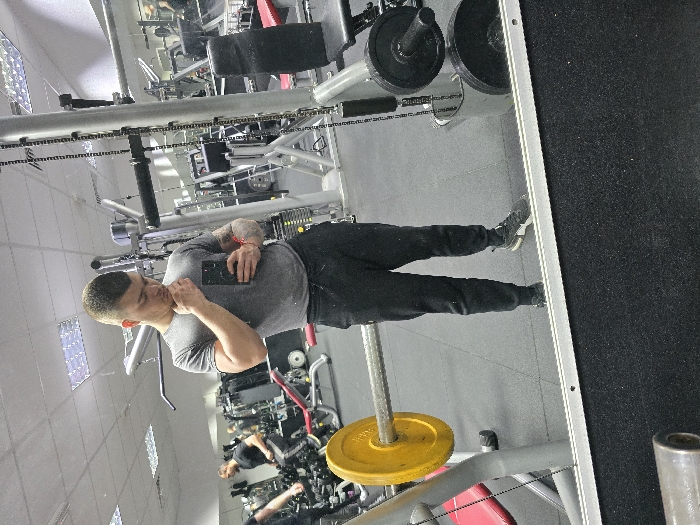 The image depicts a male posing for a mirror selfie inside a gym in Byala, Bulgaria