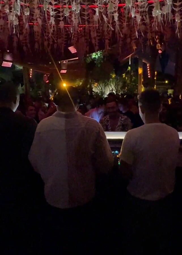 DJ booth at night, with two DJs visible from the back, operating equipment. Behind them, a crowd of people are standing and moving to music. The lighting is red and ambient. Above, a decorative structure hangs from the ceiling, illuminated by the red lights. The environment appears to be an outdoor or partially covered venue with hints of foliage and architectural structures in the background.