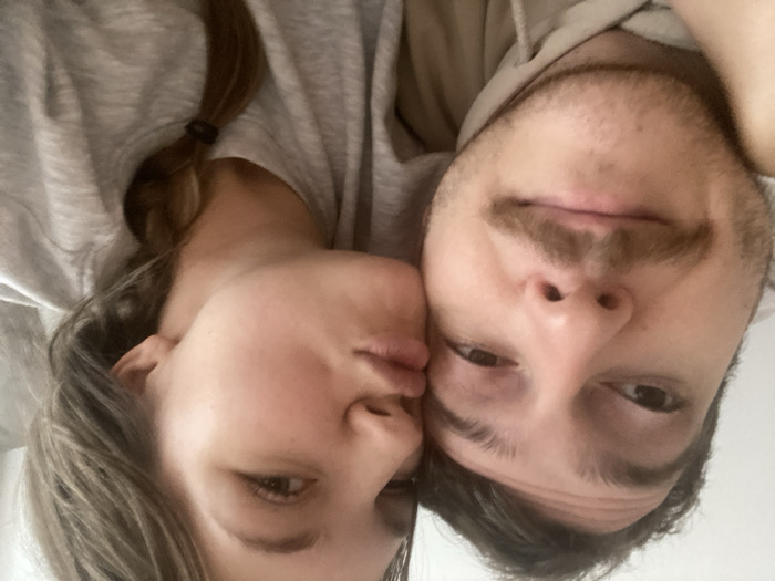 The image depicts a close-up, indoor selfie featuring two individuals, one male and one female, in an affectionate pose