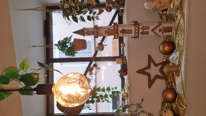 An interior scene in Le Puy-en-Velay, France, showcases a decorative display positioned against a large, multi-pane window. The specific location within the city is not discernible from the view through the window. In the foreground, a large, illuminated, clear glass light bulb with an exposed filament hangs from the ceiling, partially obscured by artificial green ivy vines. Below, a white window sill and a lower surface covered with draped metallic gold fabric serve as platforms for numerous decorative objects. On the window sill, scattered gold and bronze spherical ornaments are present alongside artificial green foliage. A small, lit gold candle in a holder and a larger, unlit cream-colored cylindrical candle are visible. A small, dark-colored wooden sleigh decoration is also positioned here. The central focus is a tall, multi-tiered decorative tower structure, cream-colored with gold accents, featuring small windows and balconies, suggestive of a stylized castle or church spire. To the right, a partial view of a brown teddy bear and a light-colored, fluffy animal figure resembling a squirrel are visible. Two potted plants in woven baskets are suspended from the ceiling in front of the window, one with solid green leaves and the other with variegated green and white foliage, the latter adorned with small gold ornaments. A horizontal string of small gold ornaments is strung across the upper portion of the window frame. On the gold-draped surface below the sill, a large, glittery, bronze-gold five-pointed star with a hollow center is prominent. Two large, spherical bronze-gold ornaments and another small golden cylindrical candle are also placed here. Through the window, an urban environment is visible, featuring light-colored, multi-story buildings with dark-framed windows under an overcast or diffused sky. No discernible individuals or active elements are present in the image.