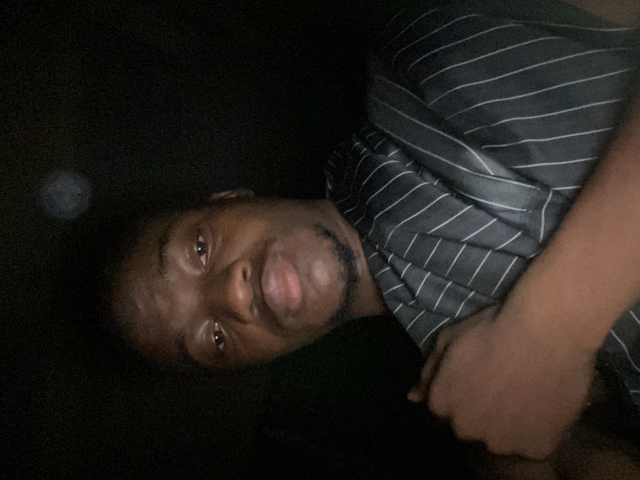 A man with dark skin and short, dark hair is lying down, facing the camera. He has a goatee and his lips are slightly parted. He is wearing a dark-colored shirt with thin, light-colored vertical stripes. The background is very dark, with a faint, round blur in the upper left corner. The lighting is dim and uneven, casting shadows across his face and shirt.