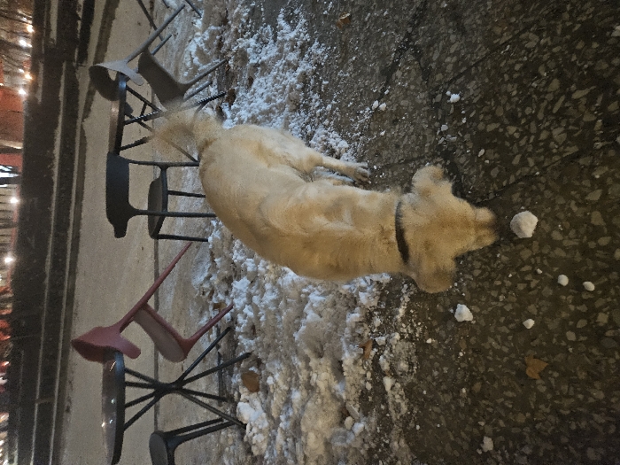A tan dog with a black collar stands on concrete, nose to a snowball. Light snow covers the ground around the dog and some chairs and tables. One chair is red; the others are black and grey. A building is visible in the background, lit with string lights.