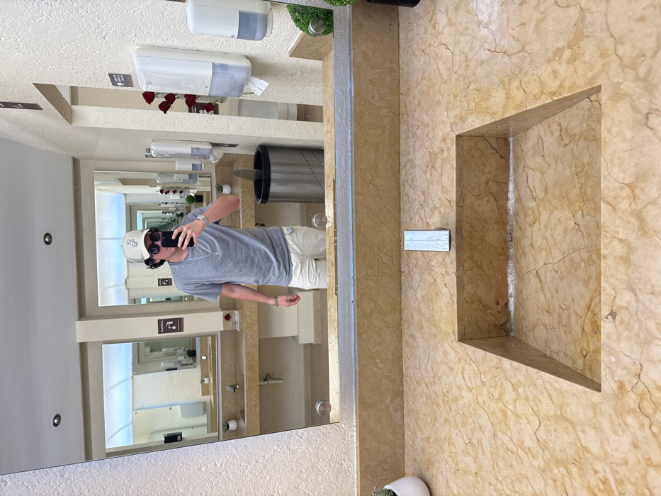 A mirrored bathroom scene shows a person reflected taking a selfie. The person is wearing sunglasses, a baseball cap, a grey shirt, and white pants. Behind them, a mirrored wall and multiple sinks are visible, along with paper towel dispensers. To the right, a textured stone wall with a built-in shelf and soap dispenser is shown. A plant is placed near the base of the wall.