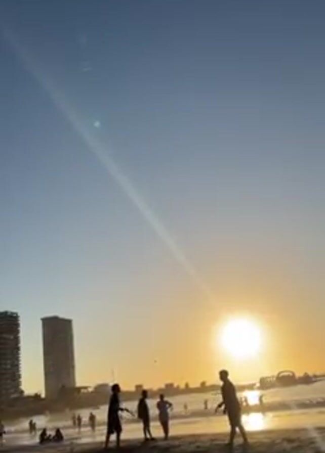 The video depicts a beach scene at sunset. Silhouetted figures of people are scattered across the sand, with some standing and others sitting or walking near the shoreline. The sun is setting over the ocean, casting a golden glow across the sky and water. In the foreground, a group of people appear to be playing catch with a ball or frisbee. Two tall buildings are visible in the background, and an inflatable structure is partially visible in the water. The camera angle is slightly low, looking up towards the sky and sun.
