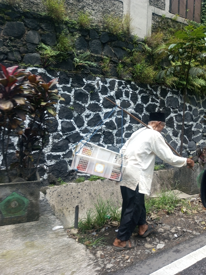An elderly male is depicted walking from right to left on a concrete path in Chori, Nigeria. He wears a black cap, a light-colored long-sleeved tunic, black trousers, and dark sandals. He carries a wooden shoulder pole balanced across his right shoulder, from which two white rectangular plastic crates are suspended by blue ropes. The crates contain small, colorful items; one crate displays a circular white face, possibly a clock or scale. The path borders a darker paved surface on the right. To the left, a raised retaining wall is constructed from dark, irregular stones with prominent white grout patterns. Green vegetation, including ferns and grasses, grows on and above the wall. A portion of a building, featuring a concrete column and a dark window-like area, is visible in the upper background.
