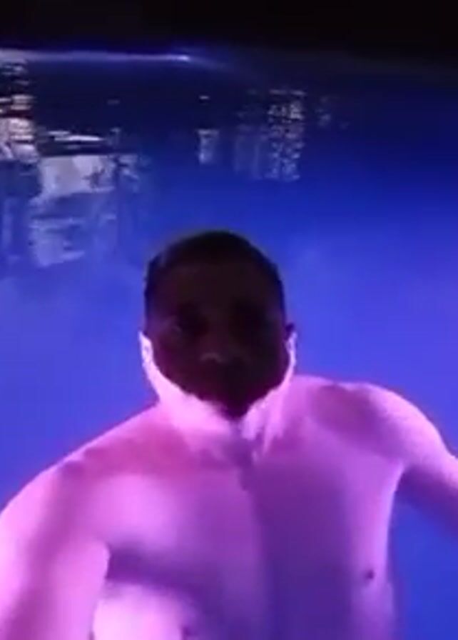 A person with dark hair and a light-skinned complexion is in a pool, with the water illuminated in blue and pink