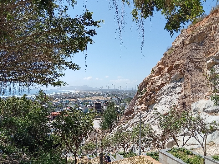 This elevated daytime image presents a panoramic view overlooking a coastal city in Unknown, Vietnam, under a clear blue sky. In the foreground, dense green tree foliage with visible hanging vines occupies the upper left, partially framing the scene. To the right, a steep, layered rock cliff face exhibits varying shades of brown, gray, and white rock formations. Below the cliff, a landscaped area features a series of steps or a path bordered by ornate, possibly golden-colored railings and planters containing small green shrubs. Two indistinct human figures are discernible on these steps in the lower-middle portion of the frame. The midground reveals an expansive urban settlement composed of numerous low-rise buildings with mixed roof colors, extending towards the coast. A blue body of water, consistent with a sea or ocean, is visible along the horizon to the left, with a distinct white surf line marking the shoreline and an adjacent sandy area. The background features a range of hazy, distant mountains or hills. Prominently, a large array of white wind turbines, indicative of a wind farm, stretches across the landscape to the right of the mountains.