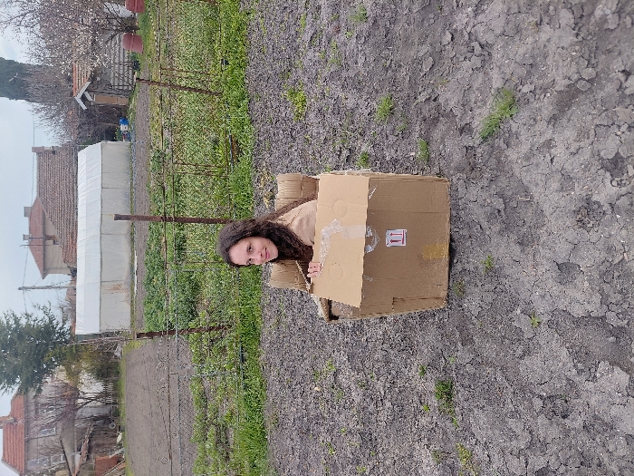 - "A female subject with long, dark, wavy hair and a light-colored top is positioned inside a brown cardboard box, smiling directly at the viewer" by FM-6t0r93, licensed under CC BY 4.0