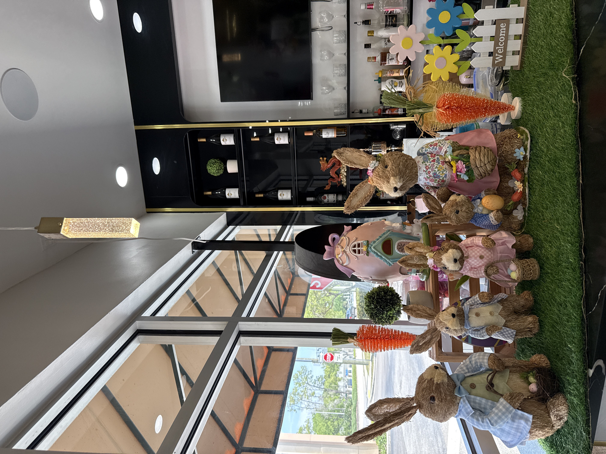 This image captures an indoor Easter display set against large windows overlooking an urban street in Naples, United States. The foreground features a dark, reflective counter topped with artificial green grass, showcasing six straw-textured rabbit figurines. From left to right, a large rabbit wears a blue plaid jacket and holds a small egg basket, followed by a medium-sized rabbit in a similar blue plaid outfit with an egg basket, then a medium-sized rabbit in a pink plaid dress with an egg basket. To their right, a large rabbit wears a floral top and pink skirt, holding a flower basket, accompanied by a small rabbit in a blue polka-dot outfit holding an orange egg. A sixth, smaller rabbit is partially visible behind the large female. Behind the rabbit figures, a large pink egg-shaped house with a blue door and white trim rests on a wooden crate. Flanking the house are two tall, orange bristly carrot decorations and a small potted green topiary. To the far right of the display, a miniature white picket fence sign reads "Welcome," positioned in front of three colorful wooden flower stakes. The indoor background features a modern aesthetic with a white ceiling containing several recessed lights and a rectangular pendant light with a textured glass body. To the right, a tall black shelving unit with gold trim displays wine bottles and a red dragon figurine. Below a wall-mounted flat-screen television, a bar area is visible, stocked with various liquor bottles, clear glasses, and bar accessories. Through the large glass windows, an exterior street scene is visible. A paved road with a white stop line and a prominent red octagonal "STOP" sign on a white pole can be seen. Green trees and foliage line the street, and a light-colored vehicle is present on the road under a clear blue sky. An external architectural overhang with a brown underside is visible above the street view through the windows.