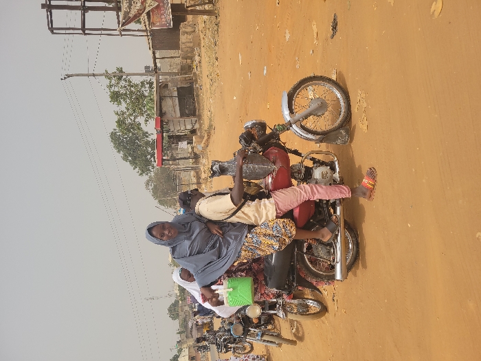 An outdoor street scene in Suleja, Nigeria, is depicted under a light grey, hazy sky