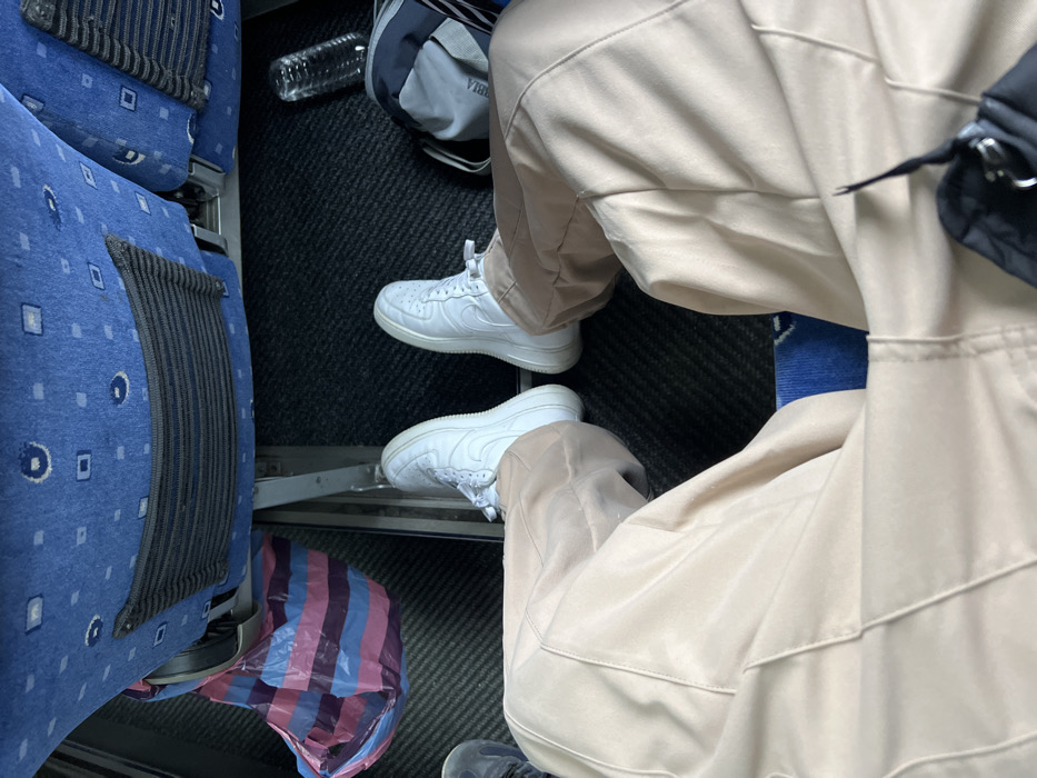 The scene is situated inside a public transport vehicle in Barziya, Bulgaria, viewed from a first-person perspective. The lower body of an individual is depicted, wearing light tan cargo-style trousers and white athletic shoes, specifically Nike Air Force 1s. The individual's feet rest on a dark grey, textured floor covering. Two blue upholstered seatbacks with patterned fabric and dark grey mesh pockets are visible directly in front. To the left, a pink and blue striped plastic bag is partially visible on the floor beneath a seat. To the right, a clear plastic water bottle lies horizontally on the floor next to a partially visible grey and black backpack or bag. A small black object with a drawstring or strap is also visible near the bottom right.