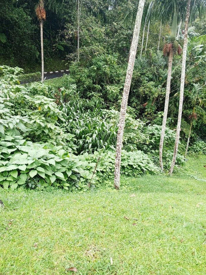 A lush green landscape features a well-manicured lawn in the foreground. Thick foliage, including broad-leafed plants and corn-like vegetation, dominates the midground. Several tall, slender trees with textured trunks stand vertically. Beyond the foliage, a road is faintly visible, lined by a dense tropical forest backdrop. The scene evokes a serene and natural environment.