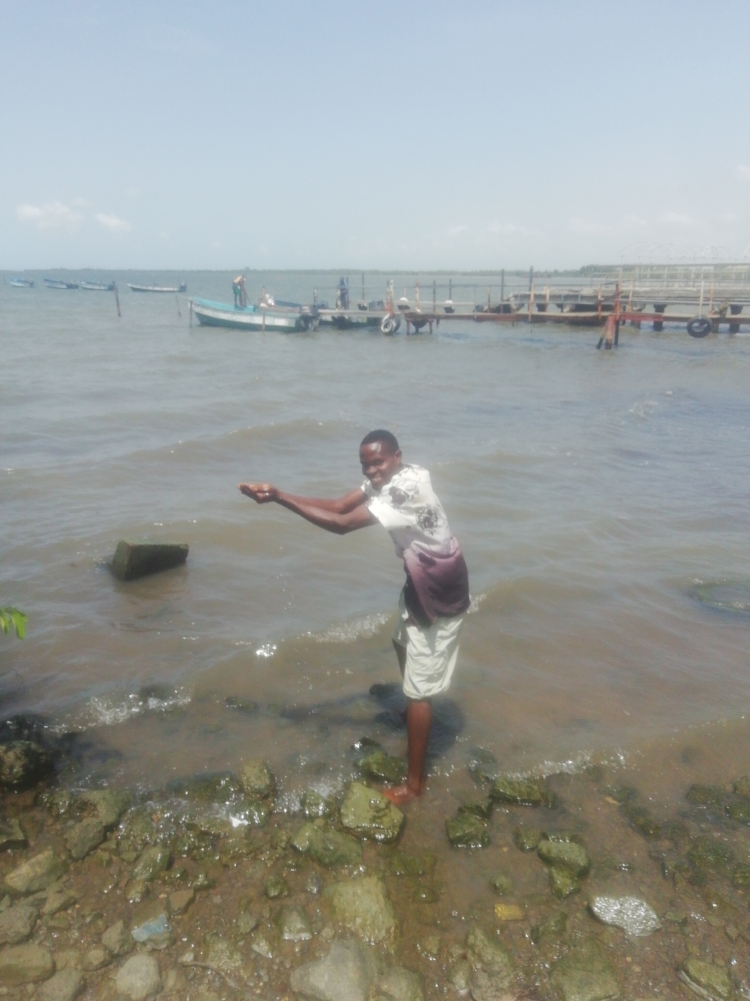 A medium shot captures a man standing in shallow water along a rocky shoreline. The man is dark-skinned and appears to be in his 20s or 30s. He is wearing a patterned short-sleeved shirt and light-colored shorts. His arms are extended, palms up, as if presenting something. Behind him is a body of water with a few small boats visible in the distance. A pier or dock extends into the water from the right side of the frame. The sky is bright with high clouds, indicating a sunny day. The foreground consists of rocks and small vegetation along the water's edge. The water is murky, suggesting sediment or algae. The scene appears to be outdoors in a natural setting. There is no specific location information given.