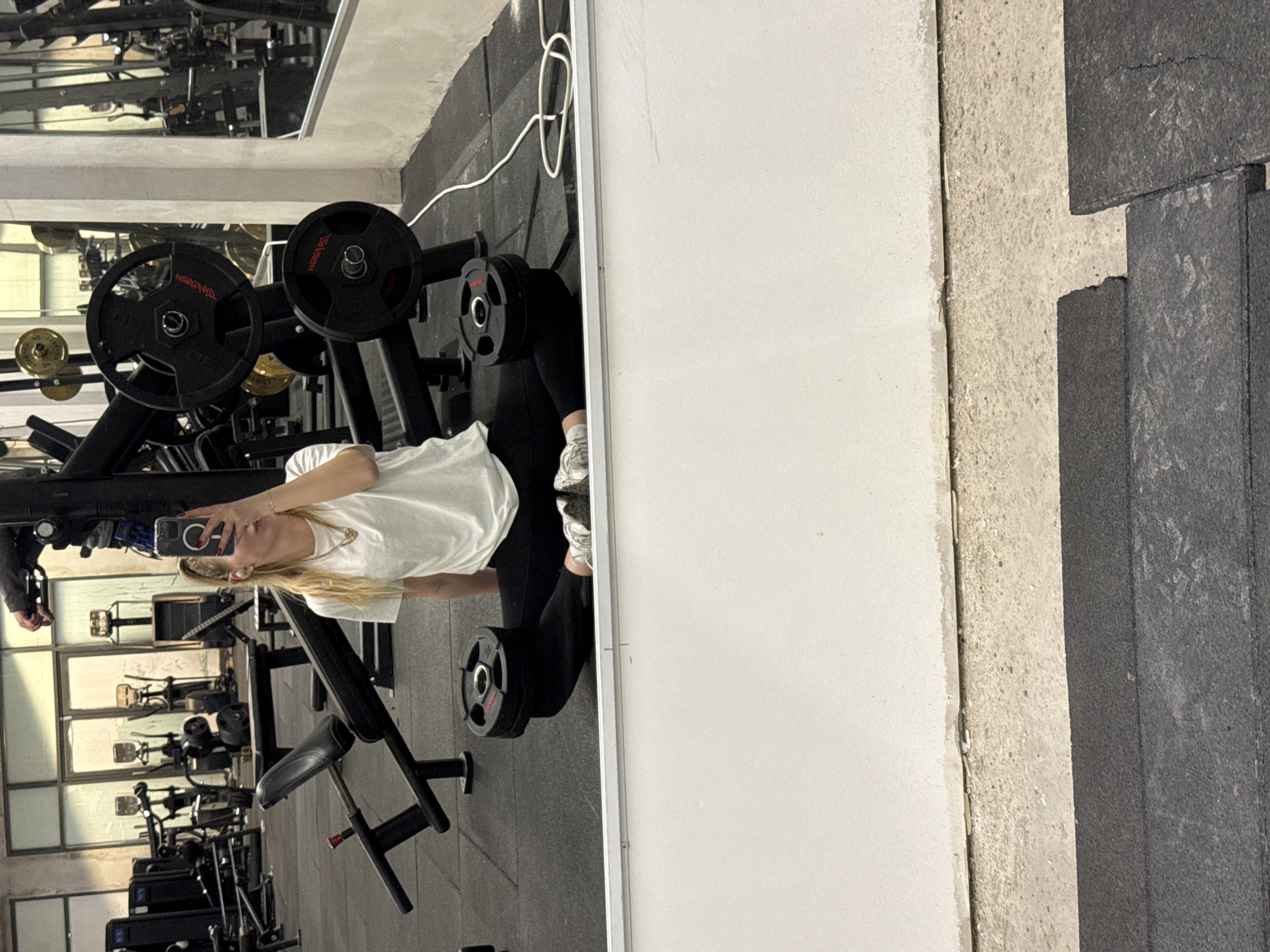 This image depicts the interior of a gym, identified as being in Katzrin, Israel. A female is prominently featured, visible through a large, wall-mounted mirror. She is seated cross-legged on black rubber floor mats, directly facing the mirror while holding a dark-colored smartphone with a circular magnetic accessory on its rear, appearing to capture a mirror selfie. Her light-colored hair is pulled back, and she wears a white t-shirt, dark leggings, and white athletic shoes. White wireless earbuds are in her ears, and a gold-colored necklace is visible. Part of her face is obscured by the smartphone. Two black barbell weight plates are resting on her bent knees. The flooring consists of black interlocking rubber mats laid over a light-colored concrete subfloor, with visible gaps and unevenness, particularly where the mats meet the white wall. A white electrical cord is coiled on the rubber mat to the subject's right. The gym's interior walls are white, exhibiting some surface wear and marks. In the background, visible both directly and through the mirror's reflection, is a variety of gym equipment. This includes a black weight rack equipped with numerous black barbell plates (some with "SPARTAN" branding) and some gold-colored plates, an adjustable utility bench, and several cardio machines, specifically ellipticals and stationary bikes, positioned near large windows or glass doors. Overhead artificial lighting illuminates the space.