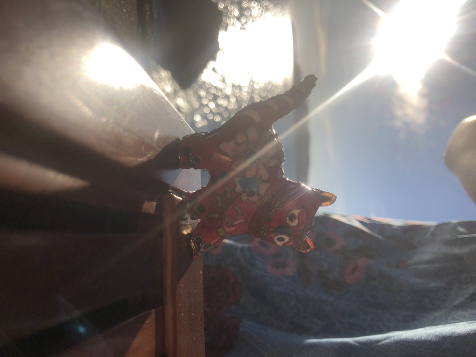 A small, red, floral-patterned cat figurine perches on a dark wooden edge. The figurine has rounded ears and prominent eyes. Sunlight streams into the scene from behind, blurring the background of a blue and patterned fabric. The light casts a strong shadow of the wooden edge onto a nearby surface. A bright, blurry patch of light reflects off a glossy surface above.