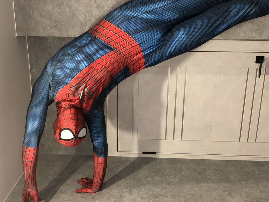 A single individual is depicted indoors, in the city of Tliustenkhabl', Russia, wearing a full-body Spider-Man costume