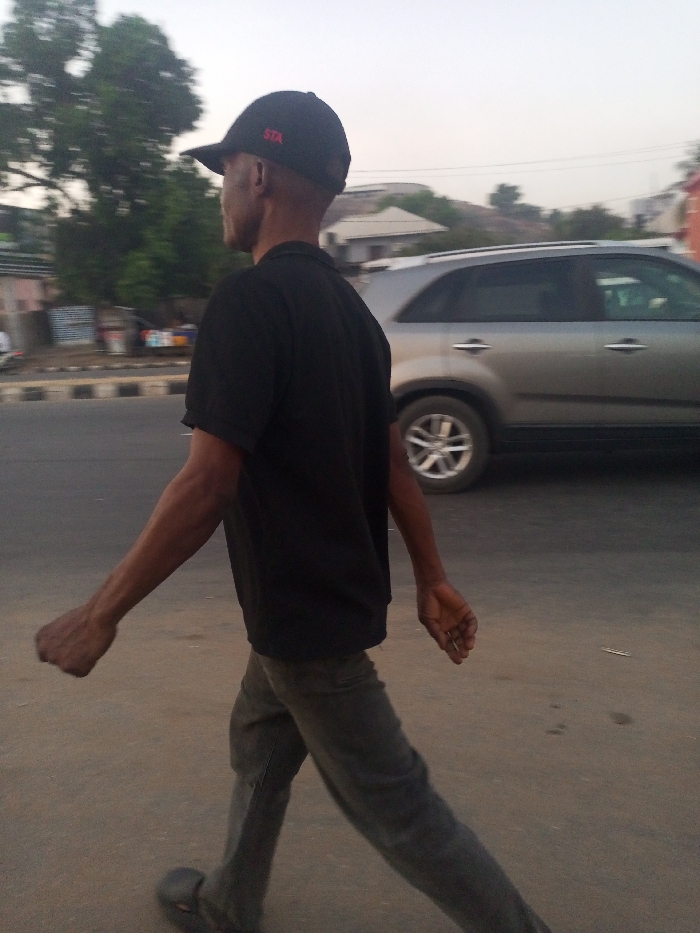 A person with a dark complexion is walking across a road. The individual wears a black t-shirt, grey trousers, and a dark cap with "STA" on the side. A light-colored SUV is parked on the other side of the road. There's a tree and some buildings in the blurred background. The lighting suggests it is late afternoon or early morning.
