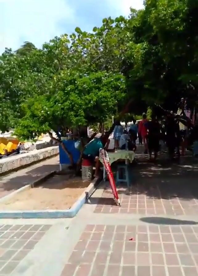 The video pans slowly across an outdoor walkway. The walkway is made of red and gray brick and is partially shaded by trees. Several people are walking along the walkway, and others are sitting on stools or standing by tables. Some tables have white cloths on them. There is a red and white object leaning against one of the trees. On the left side of the walkway is a low wall and a sandy area, with a yellow structure further back. In the background, some colorful buildings are visible, and the sky is blue with some clouds. The video ends on a shot of a woman sitting on a blue chair. She is wearing a light blue shirt, pink and white patterned pants, and a headscarf.