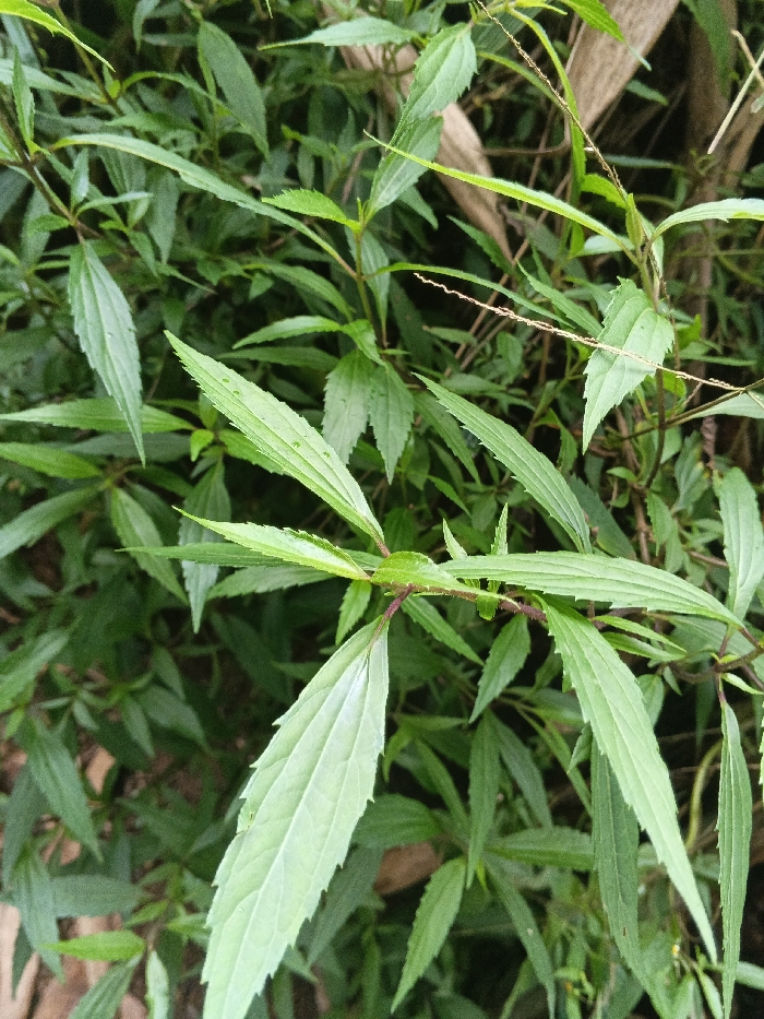 A close-up, high-angle shot captures a dense growth of green herbaceous plants in Bagochen Boolingpang Ueling, Bhutan. The primary subjects are leafy plants featuring elongated, lanceolate-shaped leaves with serrated margins and visible venation. The foliage displays various shades of green, with some plant stems exhibiting a reddish-brown coloration. Leaves appear to grow in an opposite or alternate arrangement along the stems. The background consists of blurred green vegetation, indicating a dense plant environment. Several thin, light brown, dried plant strands are present, particularly visible in the upper right portion of the frame. No human subjects, animals, or man-made objects are present. The scene is static, illuminated by ambient light.