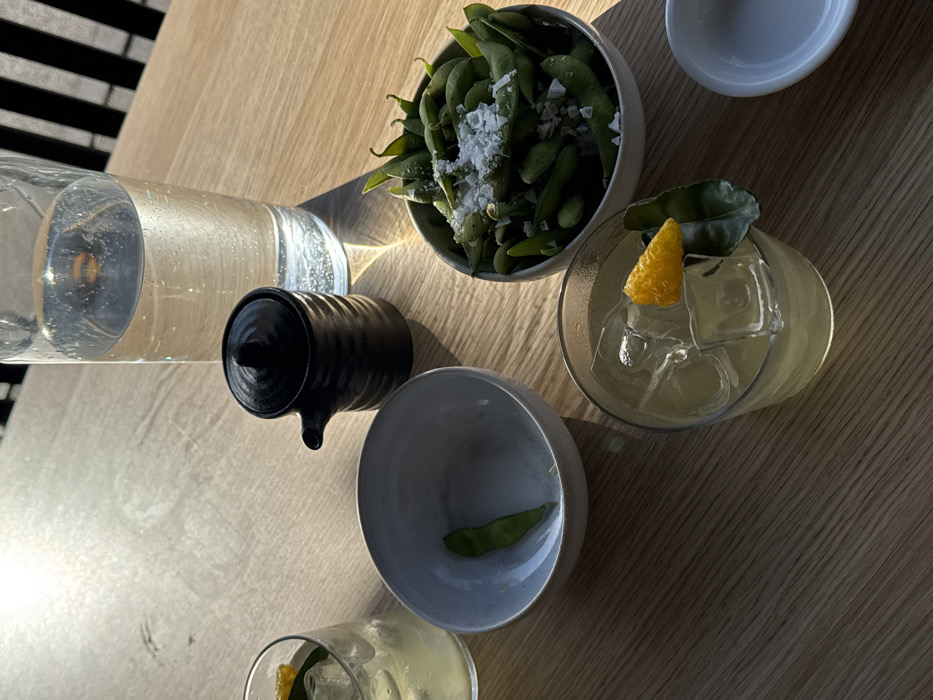An overhead shot captures a table setting with assorted items. A clear bottle of water sits alongside a black ceramic pot. A bowl of edamame sprinkled with salt is present, along with two cocktails garnished with orange peels and green leaves. Two small white bowls are also on the table, one holding a single green edamame pod. The table has a light wooden finish.