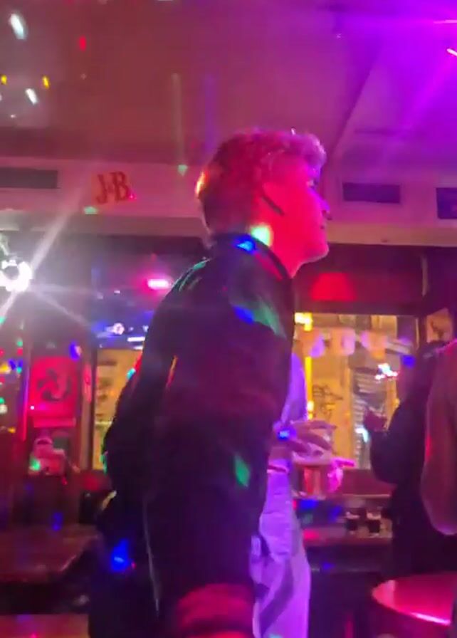 Two young men are dancing in what appears to be a bar or pub. The lighting is colorful with disco lights. One man is wearing a black jacket and holding a glass of beer, while the other man is wearing a light blue button-up shirt. They are dancing together and having fun. The bar is decorated with various signs and memorabilia, including a "JB" sign. There is a TV screen in the background displaying text. The music appears to be loud and upbeat.