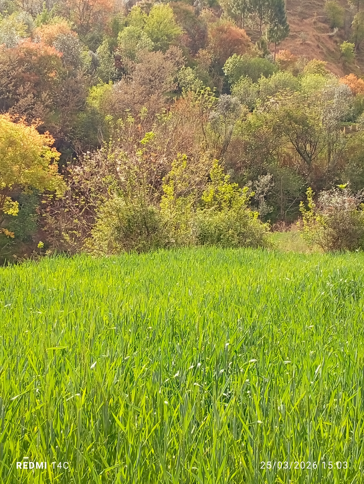 The image displays a natural landscape in Grhala, Pakistan. The lower two-thirds of the frame is occupied by a dense field of uniformly bright green, upright vegetation, consistent with an agricultural crop. The upper portion reveals a mountainous or hilly background, densely forested with a mix of deciduous and coniferous trees and shrubs. The foliage exhibits varying shades of green, brown, and reddish-orange. Portions of exposed, reddish-brown soil are visible on the upper slopes. The scene is illuminated by ambient daylight. No human figures, animals, or artificial structures are depicted. A 'REDMI T4C' watermark is present in the lower left, and the timestamp '25/03/2026 15:03' is in the lower right.