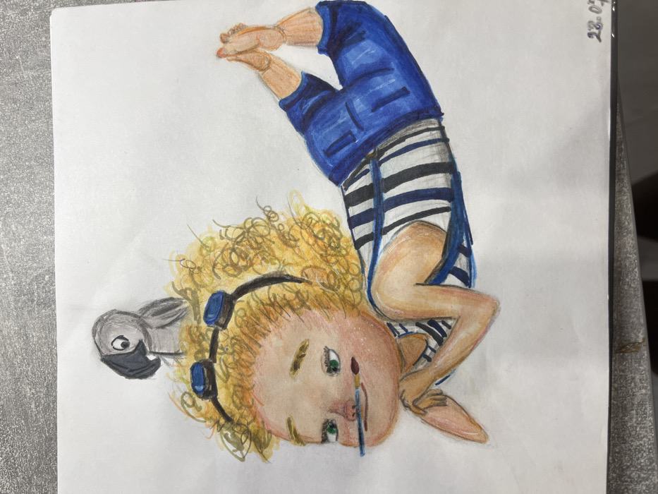 This image depicts a colored drawing rendered on a sheet of white paper, currently situated in Novo-Nikol'skoe, Russia. The drawing features a stylized, cartoon-like figure of a young person with light skin, prominent rosy cheeks, green eyes, and bright blonde, curly hair. This figure is shown lying prone, facing left, with elbows on the ground and clasped hands supporting their chin. A thin blue object, resembling a paintbrush or pen, is held horizontally in the figure's mouth. The figure wears a black headband with two blue-capped circular elements over the forehead, a blue and white striped top, and blue overalls. Perched on the figure's blonde hair is a small, grey parrot with a black beak. The figure's legs are bent upwards, with the soles of the feet touching. The drawing is executed with colored pencils or markers. The white paper itself rests on a grey, textured surface. In the bottom right corner of the paper, faint handwritten text "28.07." is visible.