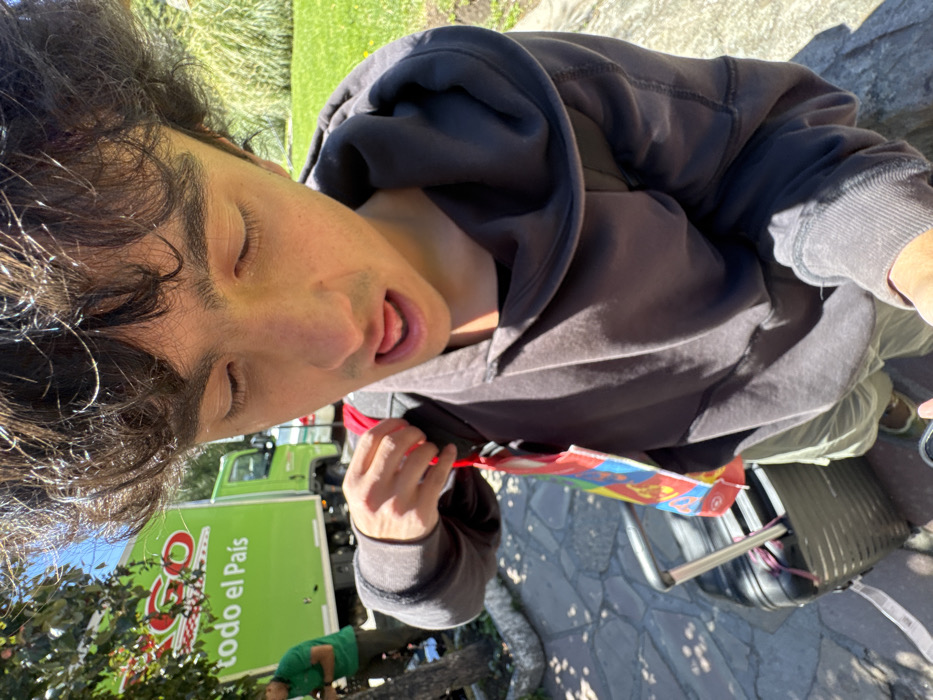 A young man in a gray hoodie and khaki pants stands outside with a suitcase. He has dark, curly hair, closed eyes, and his tongue slightly protruding. A green truck with "GO todo el País" written on its side is visible in the background. A person in a green shirt is bent over near the truck. The ground is paved with stone.