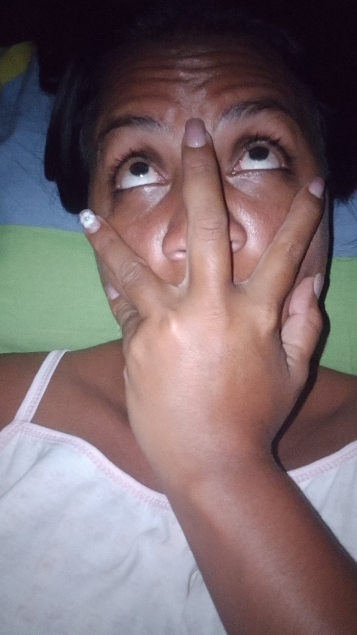 A woman lies on her back with her hand covering her face, fingers spread. She wears a white tank top with thin pink straps. Her eyes are open, looking upwards. Her skin is dark and appears slightly damp. One fingernail is painted with a white design. The background consists of green and blue fabrics, possibly a bedspread. The lighting is low and uneven.