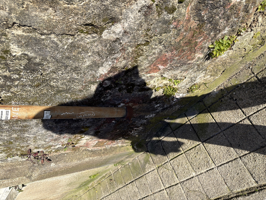 The image displays a sunlit urban alleyway or narrow street in Porto, Portugal. A tiled pathway, constructed from square, light grey concrete pavers, occupies the lower left portion of the frame. To the right, a heavily textured, weathered wall, possibly stone or concrete, exhibits varied coloration including grey, brown, and reddish tones, with patches of green moss and small plants growing along its surface and crevices. A rusty, brown metal pipe is affixed vertically to this wall. The pipe features a white sticker with black Portuguese text including "STUPIDOR" and a phone number, and a vertically written inscription that appears to read "VAYESSA" or "VANESSA". A long, dark shadow of a person, extending from the left, is cast across the tiled ground and onto the lower section of the weathered wall. This shadow suggests the individual is facing the wall, possibly holding an object in their hand. A secondary, fainter shadow is present alongside the main figure's shadow on the pavement. A lighter concrete wall or barrier runs parallel to the tiled path on the far left, also featuring sporadic plant growth.
