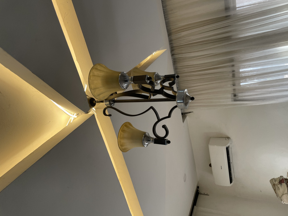 The image displays an interior room located in Gwarinpa, Nigeria, featuring a decorative ceiling and various furnishings. A multi-light chandelier, centrally positioned, hangs from the ceiling. It possesses a dark, possibly wrought iron or bronze, frame with curved arms supporting at least five bell-shaped light fixtures, three of which are clearly visible. Each fixture has a ribbed, opaque, cream-colored glass shade and chrome or silver-toned accents at its base. The ceiling features a multi-level design with light grey panels and intersecting raised, lighter-toned beams. Warm-toned LED strip lighting is recessed along the edges of these beams, casting an upward and ambient glow. On the left wall, a white wall-mounted split-system air conditioning unit, branded "Hisense," is installed. To the right, a large window area is covered by sheer, light-colored (likely white or off-white) floor-length curtains, allowing diffused natural light into the space. A small section of a light-colored sofa or armchair with a patterned cushion is visible in the bottom-left corner, indicating a furnished residential or commercial space. No individuals are present, and no specific actions or interactions are occurring.
