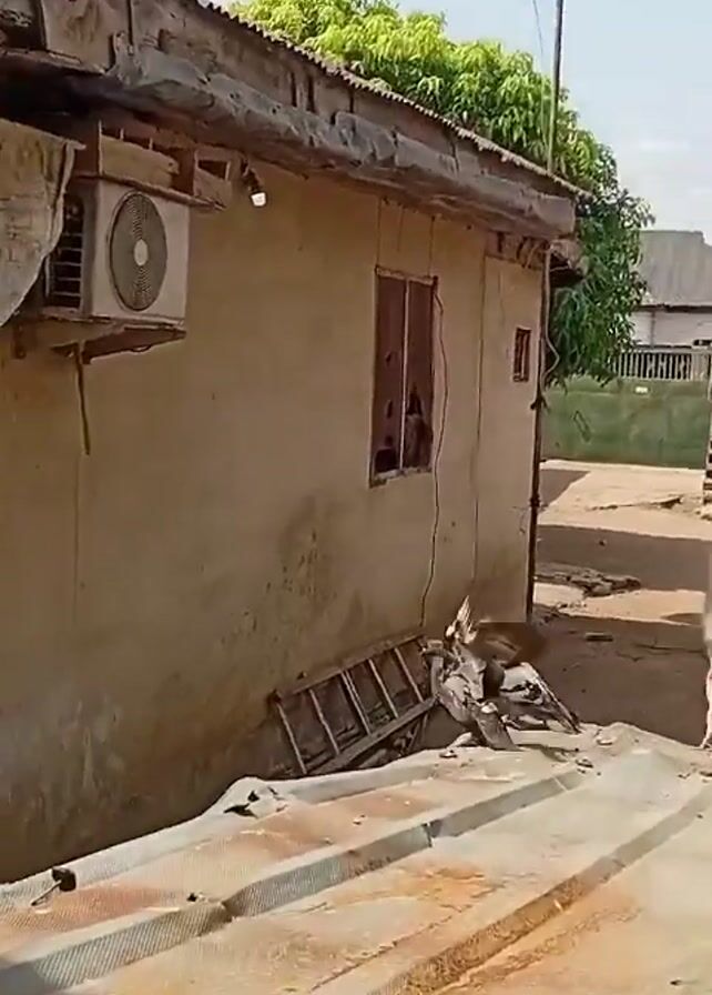 courtyard area with several birds flying around. There is a building on the left with an air conditioning unit and a window with the pane missing. A ladder is leaning against the building. To the right, there is another building with a door and stairs leading up to a second level. A light post stands in the background. The courtyard is mostly dirt with some debris scattered around. The birds fly around the courtyard, and some land on the roof of the building on the left. The sky is blue with some white clouds. Some green foliage is visible in the background and near the top of the frame.