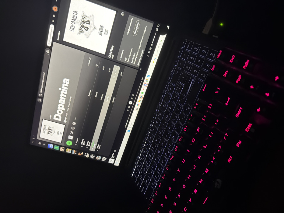 This image depicts a dark-colored laptop in a dimly lit environment, characteristic of a room in Sandanski, Bulgaria. The laptop screen displays the Spotify application, showing the album "Dopamina" by artist MBT. The album art, visible on both the main display area and a smaller thumbnail, features a stylized triangular emblem with dollar signs. The Spotify interface is predominantly in Bulgarian, showing track listings with corresponding play counts and durations. The laptop's keyboard is backlit, with the primary alphanumeric keys illuminated in white and several modifier keys, including the lower rows and arrow keys, emitting a pink/magenta light. The keyboard features a Cyrillic character layout in addition to Latin characters. To the immediate right of the keyboard, a glowing green LED light is visible, indicating an active state or connected peripheral. No individuals are present in the scene.