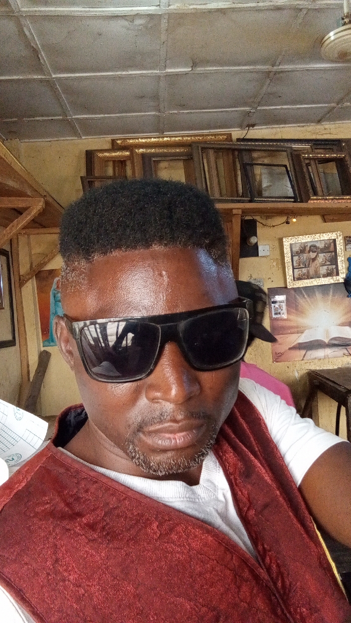 An adult male is depicted in a close-up selfie, taken indoors within what appears to be a picture framing shop or similar commercial establishment in Sardauna, Nigeria