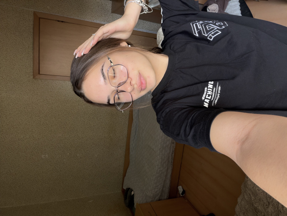 A female subject, appearing to be a young adult, is captured in a close-up, upward-angled self-portrait within an indoor residential setting. She has dark hair, which is partially styled by her raised left hand, with fingers touching her head above her right ear. She is wearing hexagonal-framed glasses with light-colored rims, and her eyes are closed or mostly closed. Her lips are slightly parted. She wears a small pearl stud earring in her right ear and a ring on her left ring finger. Multiple silver-toned bracelets are visible on her left wrist. The subject is wearing a black t-shirt with white text and graphics: "FITNESS MACHINE INTERNATIONAL rebelize people" on the left chest area and a geometric design on the right. The background shows a room with light brown, subtly patterned wallpaper. To the left, a light-colored wooden nightstand or cabinet is visible next to a bed with a white, textured comforter. On the wooden floor near the bed, a white power adapter with a cord is present. To the right, a light-colored wooden door and its frame are partially visible. The lighting in the room appears dim. The specific location within the city of Sofia, Bulgaria, cannot be determined from the visual information presented in the image.