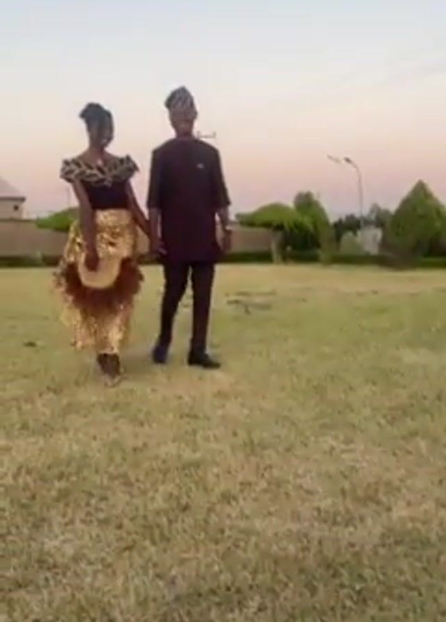 A young couple is walking hand-in-hand across a grassy lawn, smiling at each other. The woman is wearing a two-piece outfit consisting of a dark brown top with gold accents and a long, gold skirt. She is also carrying a brown fan. The man is wearing a dark brown, long-sleeved shirt and dark pants, with a patterned brown cap. The background features a fence, some greenery, and a few buildings under a bright, clear sky. The camera is relatively steady, focusing on the couple as they move.