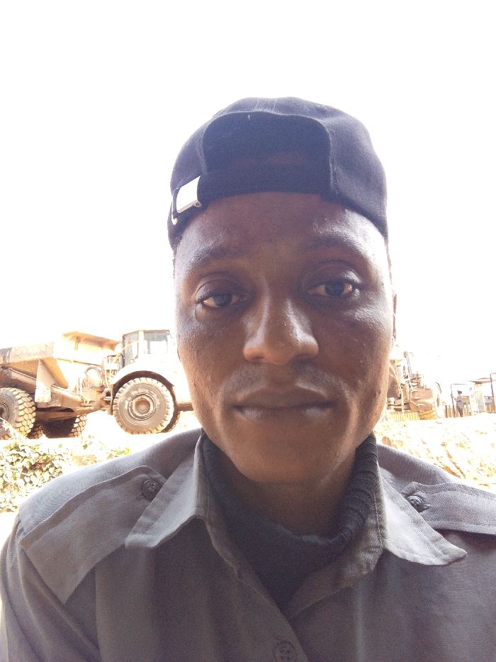 A man with dark skin and a black baseball cap poses for a selfie. He wears a grey uniform shirt with a dark turtleneck underneath. The background is slightly overexposed, revealing large construction vehicles, including a dump truck. The setting appears to be an outdoor construction or mining site.