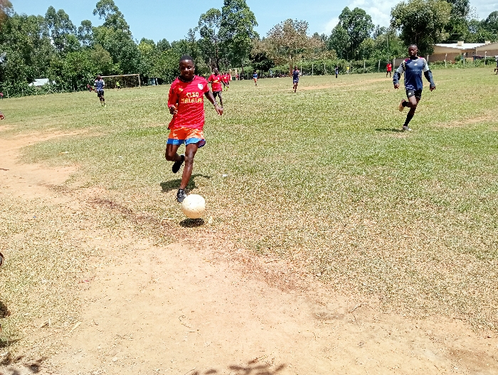 The scene depicts an outdoor football match in Chevaywa ward, Kenya, under a clear blue sky