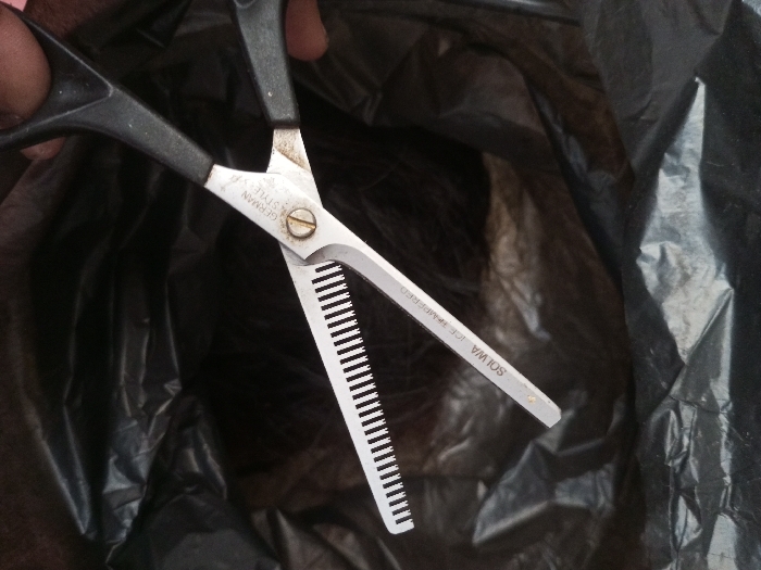 - "Hair thinning scissors are held open over a black plastic bag" by FM-O0Epn2, licensed under CC BY 4.0